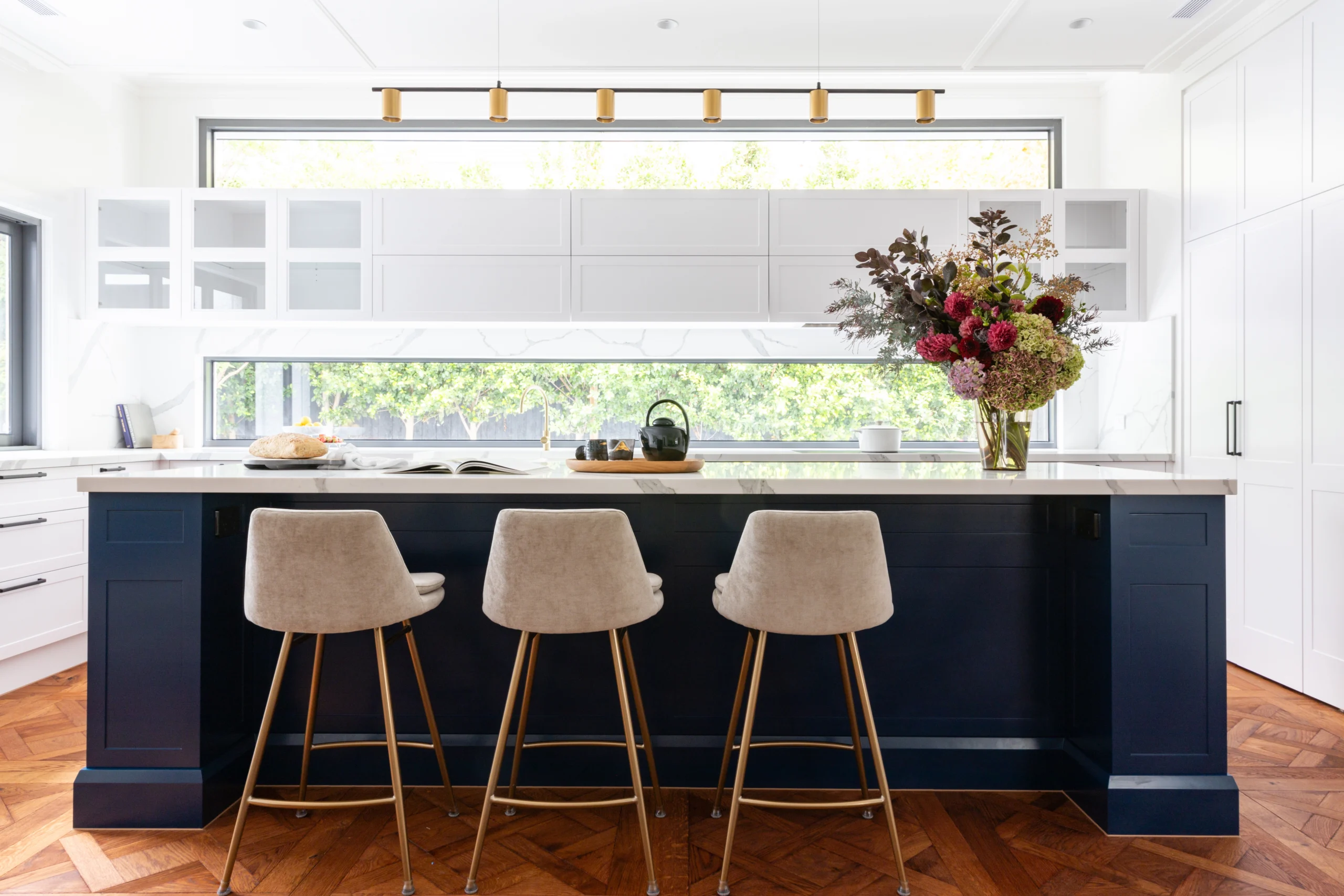 large-format polished porcelain floor tiles, sleek black cabinets, and a sparkling champagne-coloured feature tile. These elements come together to evoke an exquisitely refined celebratory ambiance, perfect for gatherings.